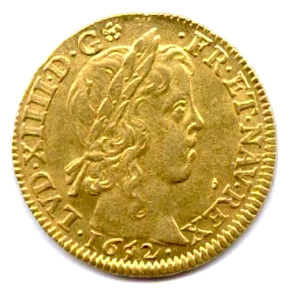 Tête laurée du roi enfant, avec la mèche longue. Dessous, millésime entre deux points. Fleur à cinq pétales ou rose au-dessus de la tête. Couronne avec baies. R/. Croix formée de huit L couronnés cantonnée de quatre lis. Au centre, lettre d'atelier. Légende commençant à 6h.