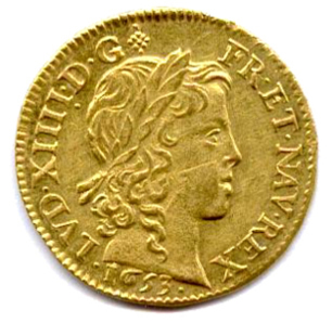 Tête laurée du roi enfant, avec la mèche longue. Dessous, millésime entre deux points. Grappe de raisin au-dessus de la tête. Point sous le 4e I de XIIII. Sans baies. R/. Croix formée de huit L couronnés cantonnée de quatre lis. Au centre, lettre d'atelier. Légende commençant à 12h. Triangle sous le R de CHRS.