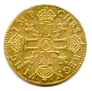 Tête laurée du roi enfant, avec la mèche longue. Dessous, millésime entre deux points. Grappe de raisin au-dessus de la tête. Point sous le 4e I de XIIII. Sans baies. R/. Croix formée de huit L couronnés cantonnée de quatre lis. Au centre, lettre d'atelier. Légende commençant à 12h. Triangle sous le R de CHRS.