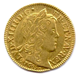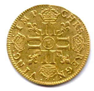 Large tête laurée du roi enfant, avec la mèche longue. Dessous, millésime. Fleur à huit pétale en début de légende. Gros point après le G de D.G. Couronne avec baies. R/. Croix formée de huit L couronnés cantonnée de quatre lis. Au centre, lettre d'atelier. Légende commençant à 12h.