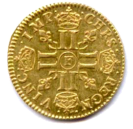 Tête laurée du roi enfant, avec la mèche longue. Dessous, millésime. Trèfle initial. Couronne de laurier sans baies. R/. Croix formée de huit L couronnés cantonnée de quatre lis. Au centre, lettre d'atelier. Légende commençant à 12h.