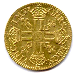 Tête laurée du roi adolescent, une grosse mèche retombant sur l'épaule. Dessous, millésime entre deux point. Moucheture d'hermine au-dessus de la tête. Couronne de laurier avec baies. R/. Croix formée de huit L couronnés cantonnée de quatre lis. Au centre, lettre d'atelier. Légende commençant à 12h. Tour en fin de légende.