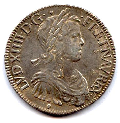 Buste lauré, drapé et cuirassé du roi enfant, avec la mèche longue. Couronne de laurier sans baies. Pétoncle sous le buste et cur transpercé au-dessus de la tête. Point après G et devant FR et point final. R/. Écu de France couronné. Lettre d'atelier à la pointe de l'écu et millésime en fin de légende. Point initial.