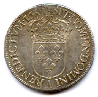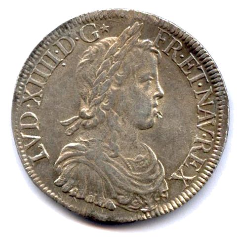 Buste lauré, drapé et cuirassé du roi enfant, avec la mèche longue. Couronne de laurier sans baies. Etoile en remplacement du point après G. Point sous le 4e I de XIIII. R/. Écu de France couronné. Lettre d'atelier à la pointe de l'écu et millésime en fin de légende. Fleur à huit pétales en début de légende. Triangle sou le O de DOMINI.