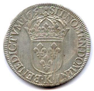 Buste lauré, drapé et cuirassé du roi enfant, avec la mèche longue. Couronne de laurier avec baies. Point après G. NA au lieu de NAV. R/. Écu de France couronné. Lettre d'atelier à la pointe de l'écu et millésime en fin de légende. Etoile en début de légende. Petit tête chauvedevant la date.