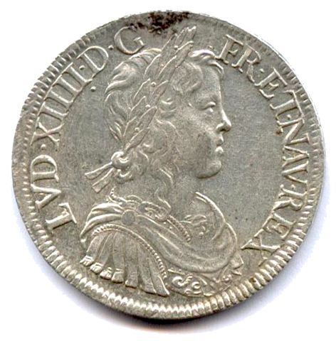 Buste lauré, drapé et cuirassé du roi enfant, avec la mèche longue. Couronne de laurier sans baies. Point sous le 4e I de XIIII. Etoile en remplacement du point après le G. R/. Écu de France couronné. Lettre d'atelier à la pointe de l'écu et millésime en fin de légende. Fleur à huit pétales en début de légende. Triangle sou le O de DOMINI.