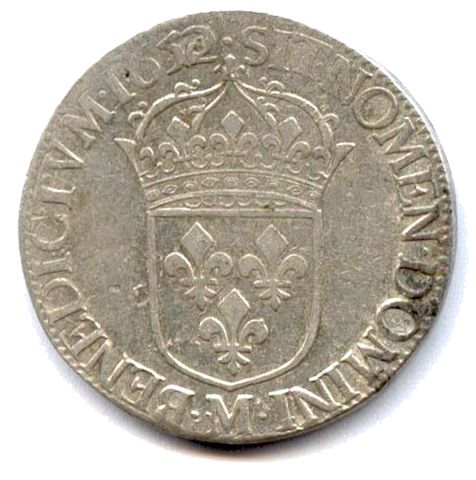 Buste lauré, drapé et cuirassé du roi enfant, avec la mèche longue. Couronne de laurier sans baies. Point après G et en fin de légende. Pétoncle dou le buste et palmette au-dessus de la tête. R/. Écu de France couronné. Lettre d'atelier à la pointe de l'écu et millésime en fin de légende. Point initial.