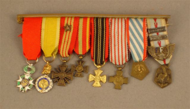 BROCHETTE MINIATURE : Légion d'honneur- Médaille Militaire - Croix de guerre- Combattant Volontaire 1939-45. Combattant Volontaire de la Résistance- Combattant 1939-45- Déportés et Internés- Commémorative 1939-45 avec deux barrettes et insigne FFI.