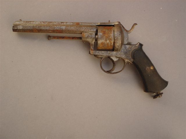REVOLVER à broche, six coups, calibre 12 mm. Canon rayé à pans. Plaquettes de crosse en ébène quadrillée. Dans l'état (oxydation). Vers 1860/1870.