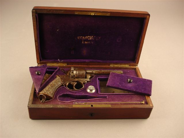 Elle contient un revolver à broche, 6 coups, calibre ?. Canon à pans, barillet et carcasse gravée (manque la baguette). Plaquettes de crosse en bois sculpté.