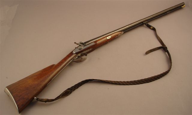 Fusil de chasse à percussion , deux coups. Canons damas, en table, de couleur tabac. Platines avants signées « Berger Ft d'Armes à St Etienne ». Chiens et garnitures gravés de rinceaux. Crosse en noyer . Baguette en fanon. Bretelle en cuir.