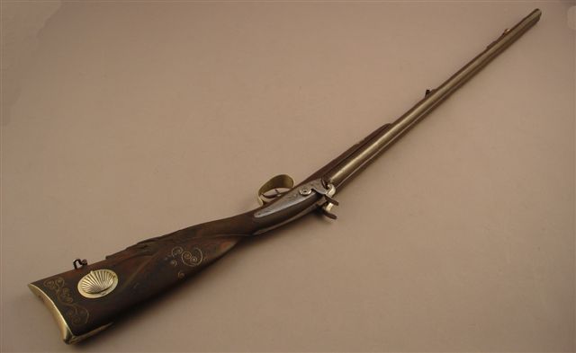Fusil de chasse à percussion , deux coups. Canons, damas, en table. Platines arrières signées « Berger Confalens ». Pontet et plaque de couche en maillechort gravés en suite. Crosse en noyer sculpté d'une tête de cerf avec boîte à amorces. Baguette en fanon.