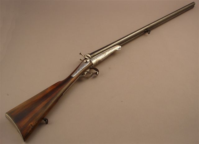 Fusil de chasse à broche système Lefaucheux, deux coups, calibre 12. Canons en table rebleuis (petites traces de piqûres). Platines arrières, chiens, bascule, pontet et garnitures gravés de feuillages, finition poli glacé. Crosse en noyer .
