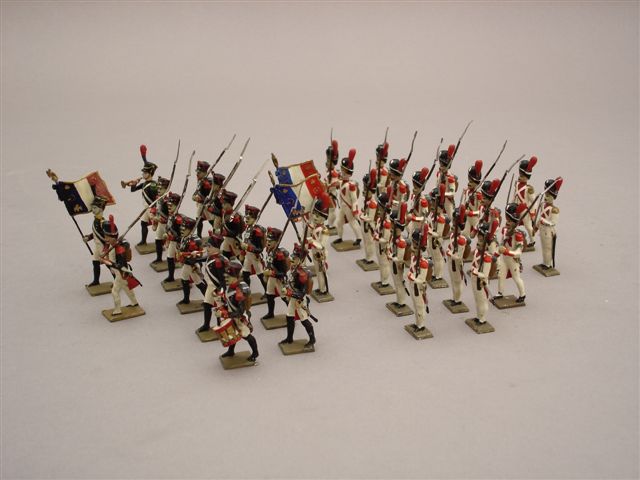 CGB, ronde bosse, 3 ème grandeur. Armée du Ier Empire. Infanterie de ligne : 1 porte-drapeau, 1 tambour, 2 clairons, 10 grenadiers. Armée de Hollande : 2 portes-drapeau, 1 clairon, 15 grenadiers et 2 officiers. Bon état d'usage.