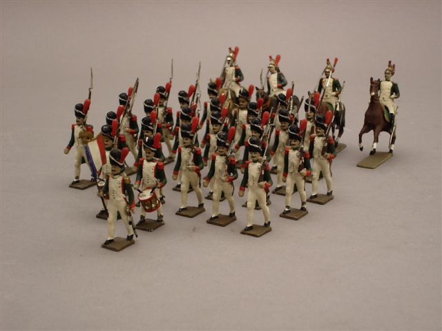 CGB, ronde bosse, 3ème grandeur. Armée du Ier Empire. Grenadiers et détachement de cavalerie comprenant 2 tambours, 1 porte drapeau, 21 grenadiers, 1 officier et 4 cavaliers. Bon état d'usage.