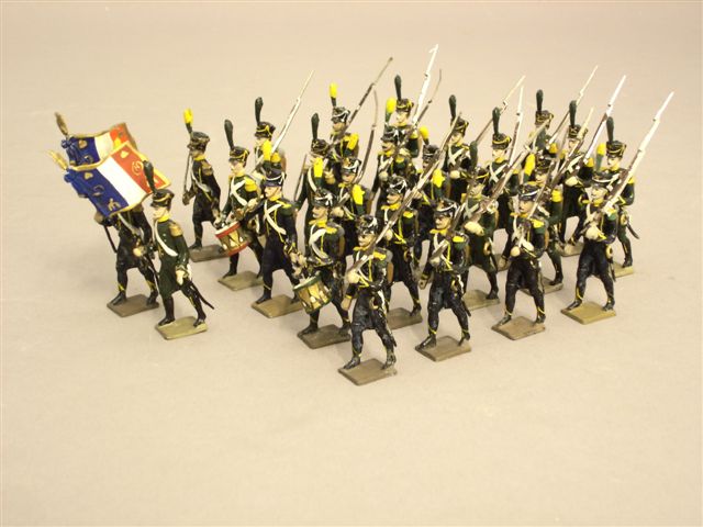 CGB, ronde bosse, 3ème grandeur. Armée du Ier Empire. Infanterie légère : 2 portes-drapeau, 1 clairon, 2 tambours, 2 officiers et 18 grenadiers. Bon état d'usage.