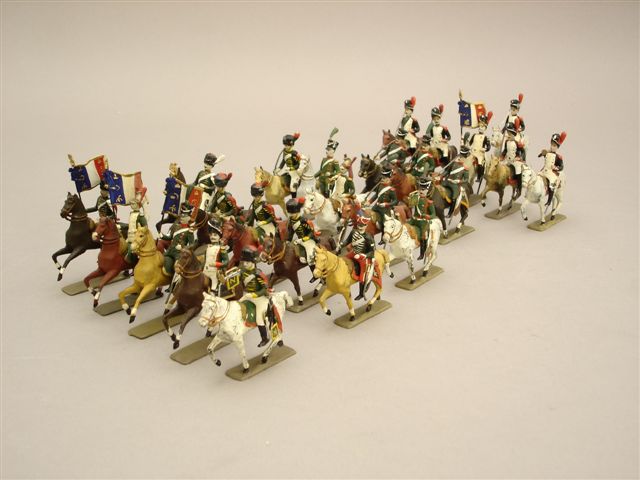 CGB, ronde bosse, 3ème grandeur. Armée du Ier Empire. Important lot de cavalerie : 24 cavaliers de la Garde Imprériale. Certains marqués CGB Made in France. État d'usage.