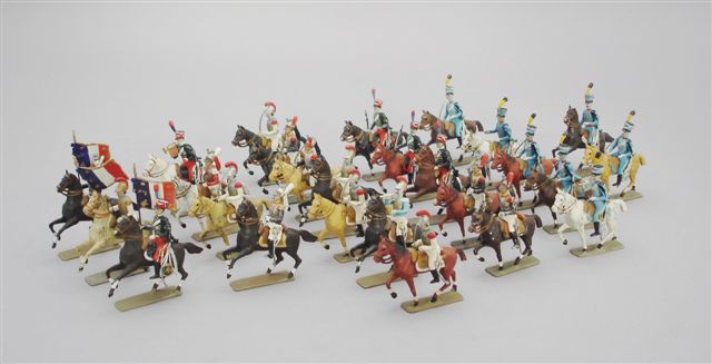 CGB, ronde bosse, 3ème grandeur. Armée du Ier Empire. Important lot de cavalerie comprenant 8 hussards, 13 cuirassiers et 5 cavaliers de la Garde Impériale. Bon état d'usage.