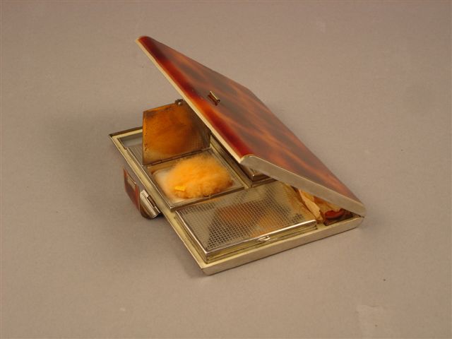POUDRIER Lancel de forme rectangulaire en métal laqué imitant la corne. Il ouvre sur un miroir, quatre compartiments fermés et deux ouverts.