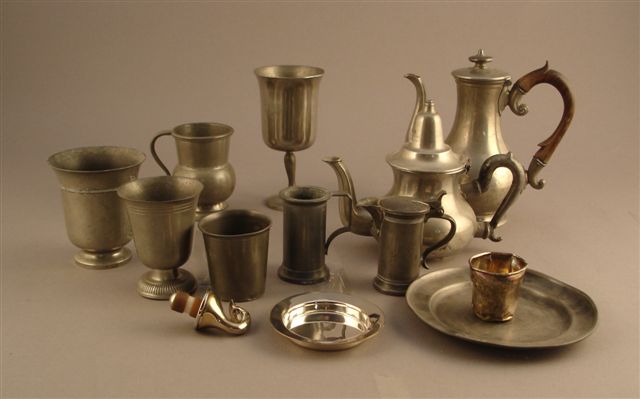 Ensemble d'ÉTAINS divers. Théières, coupes, timbales, plats et gobelet en argent accidenté.