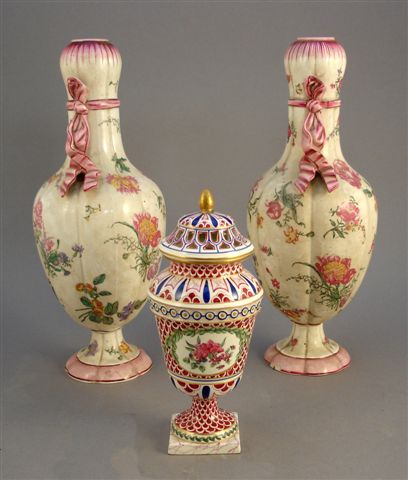 GIEN. Paire de VASES polylobés à décor de fleur ornés d'un ruban. (accdts). Haut. 37 cm.