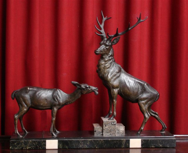 GROUPE EN RÉGULE figurant un cerf sur un tertre et une biche l'approchant. Socle en marbres polychromes. Début XXème. Haut. 63, Long. 74, Prof. 16 cm.