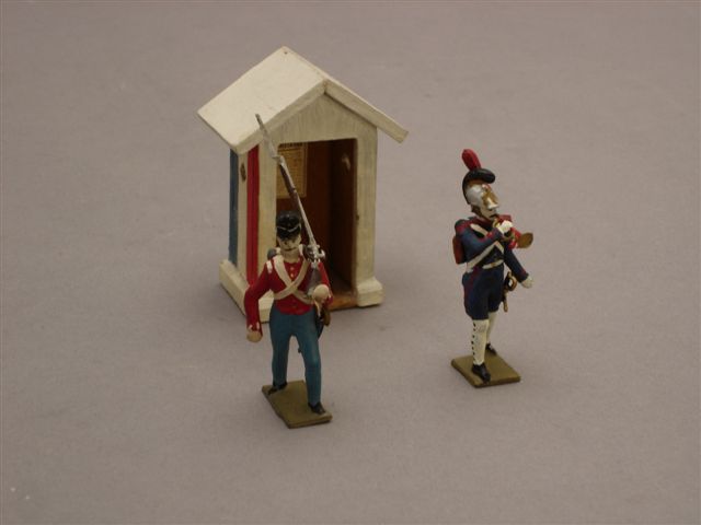 CGB, ronde bosse, 3 ème grandeur. Armée du Ier Empire. 1 grenadier, 1 clairon, 1 guérite en bois peinte en blanc et tricolore. Bon état d'usage.