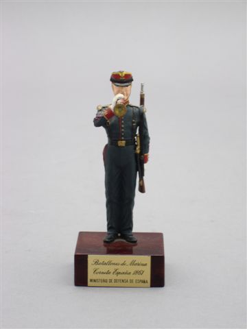 STATUETTE en étain polychrome. Clairon du bataillon de marine de l'armée espagnole sur socle en bois teinté. Édition du ministère de la Défense d'Espagne.