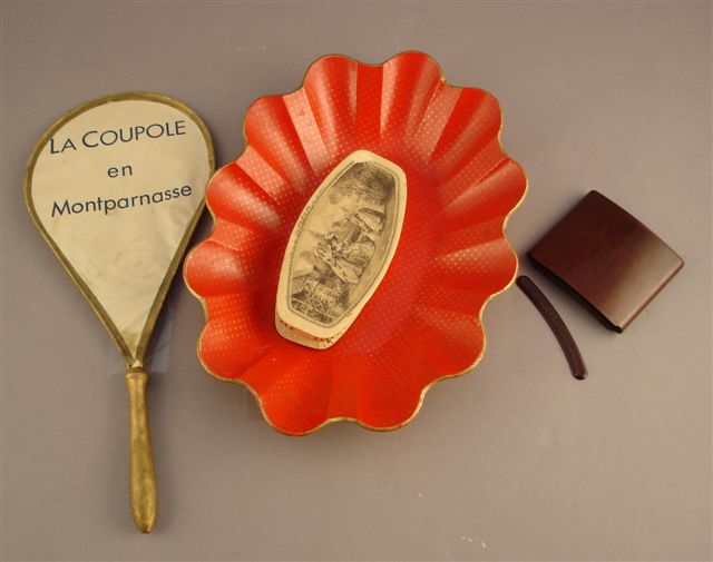 Ensemble comprenant une COUPE en carton polylobée, parsemée d'étoiles, un ÉCRAN provenant de la brasserie « La Coupole », un étui en carton et un ÉTUI Á CIGARETTES en bakélite de la marque « SPRINGBOKS » exécutée à l'occasion de l'exposition internationale de 1937 à Paris.