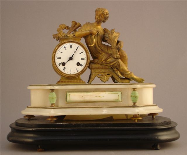 PENDULE en bronze doré. Cadran émaillé blanc, circulaire, à chiffres romains surmonté d'un trophée de musique et flanqué d'un tabouret sur lequel est assise Cérès, tenant de ses mains une faucille et une gerbe de blé. L'ensemble repose sur un socle d'albâtre, de forme chantournée porté par une base ovale de bois noirci.