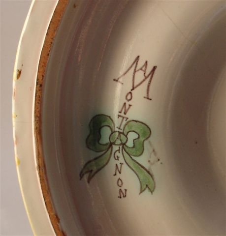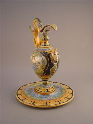 MONTAGNON. Aiguière et son plateau en céramique. Panse ornée de deux larges cartouches figurant deux personnages féminins au pied d'un arbre entouré de putti. Prise en chimère. Piédouche orné d'une frise de feuilles d'acanthe et d'un paysage lacustre. Décor en haut relief appliqué d'une tête de bouc saisissant une chute de feuillages. Signature Montagnon au revers. Le plateau, rond, est orné d'une frise de feuilles d'acanthe entourant une scène lacustre peuplée de deux poissons et d'une oie centrée du réceptacle de l'aiguière.