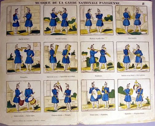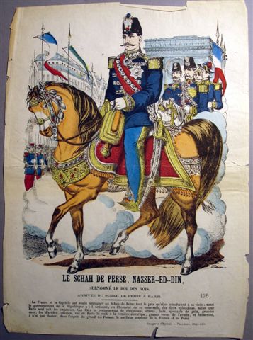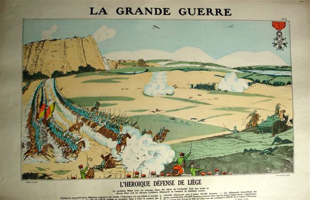 Estampes rehaussées de couleurs. "La Grande Guerre, Morts au Champ d'Honneur" par BENITO, "La Grande Guerre, L'Héroïque Défense de Liège", "Assaut de la Tour de Malakoff et prise de Sébastopol", "Musique de la Garde Nationale Parisienne", "Le Schah de Perse, Nasser-Ed-Din, arrivée du Schah de Perse à Paris."