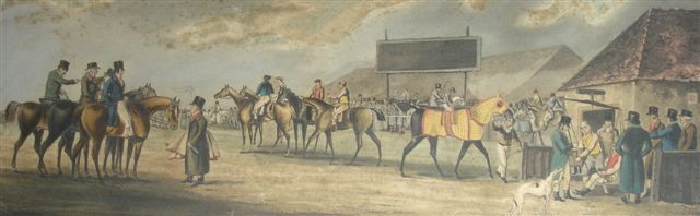 Paire de GRAVURES colorées figurant deux scènes de course.