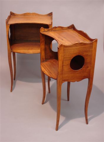 Paire de CHEVETS en bois naturel. Pieds cambrés, flancs percés de larges ouvertures circulaires, gradin du plateau chantourné.