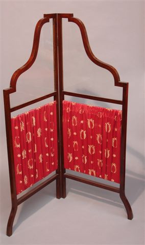 PARAVENT en acajou à deux feuilles. Partie supérieure en doucine vitrée, partie inférieure drapée.
