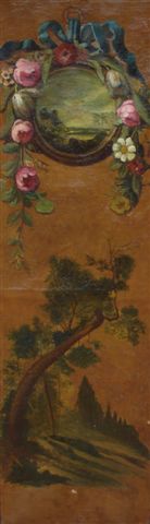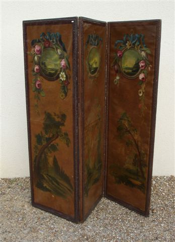 PARAVENT de trois feuilles. Constitué de 6 toiles peintes dans le goût du XVIIIème. Elles figurent des bouquets de fleurs sur une face et des paysages dans des médaillons enrubannés sur l'autre face.