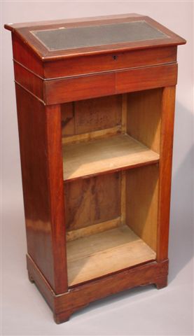 MEUBLE-ÉCRITOIRE, dit de notaire, en acajou et placage d'acajou. Dans la partie supérieure, le plan incliné bascule et découvre un casier. Façade ouverte.