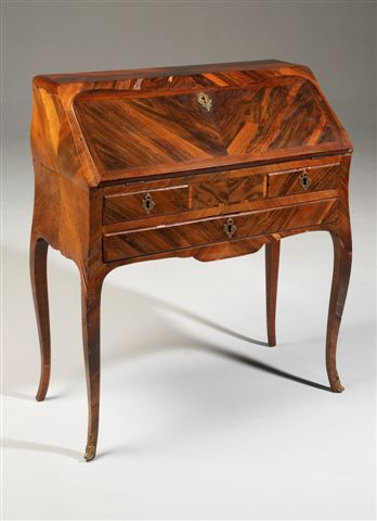 BUREAU de PENTE en bois de placage de palissandre. Il ouvre à un abattant découvrant une distribution de quatre tiroirs, un guichet et un tiroir secret. La partie inférieure ouvre à trois tiroirs sur deux rangs. Côtés et pieds galbés.