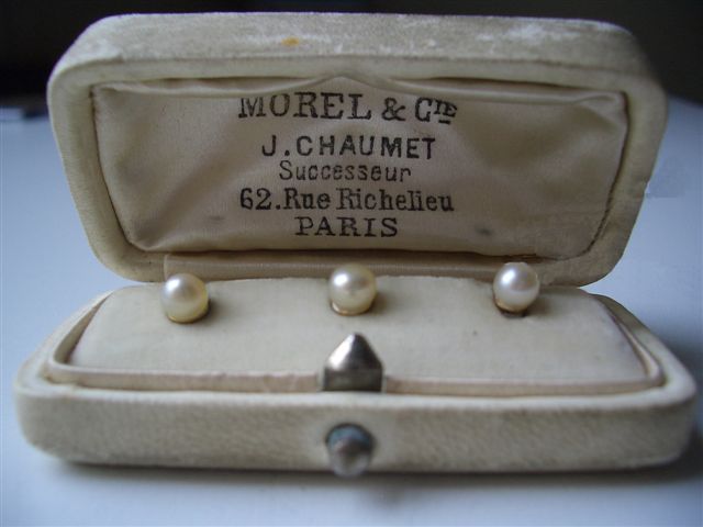 TROIS BOUTONS DE CHEMISE en or jaune, chacun orné d'une perle fine.