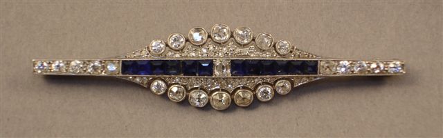 BROCHE oblongue, en platine et or gris, pavée de diamants de taille ancienne et taillés en huit huit, sertie au centre d'une ligne de saphirs calibrés.