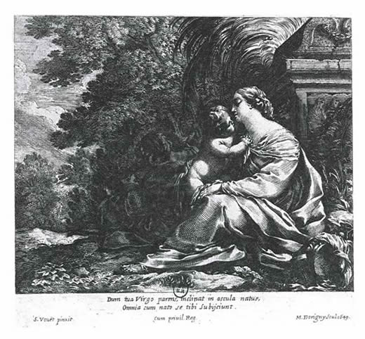 Ce tableau, correspond à la gravure inversée, datée de 1649, dernière pièce gravée par Dorigny d'après Simon Vouet de son vivant, et la seule qu'il réalisa cette année-là, sous le titre : Le repos pendant la fuite en Égypte. Le cuivre porte l'inscription : S.Vouet pinxit cum privil. Reg M.Dorigny Scul.1649, ainsi que le distique : Dum tua Virgo parens, inclinat in oscula natum, omnia cum nato se tibi subjiciunt. (De même que la Vierge s'incline devant l'enfant, de même toute chose s'incline devant toi.) .