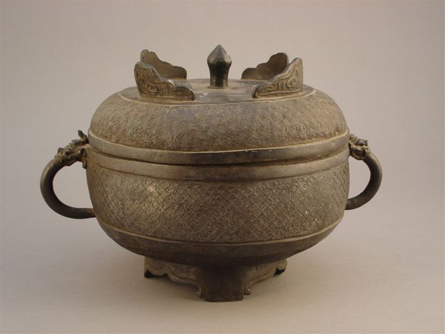 POT couvert de forme " dou " en bronze à patine brune à décor légèrement incisé de motifs géométriques et vagues, les deux anses en forme de têtes de chimères. Au revers une inscription " Collection de la maison du gouverneur Ou Yangduo, daté du printemps de l'année gengchen de Zhengde, 1520.