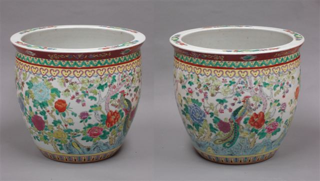 Paire de CACHE-POT en porcelaine blanche décorée en émaux polychromes de volatiles parmi les fleurs.