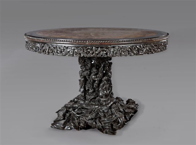 TABLE, de forme ronde en bois naturel à patine brune. Ceinture ajourée de rinceaux feuillagés portant des fruits. Piètement central d'un fût à décor sculpté. Elle repose sur une base quadrangulaire figurant un tertre rocheux planté d'arbres et peuplé d'animaux. Dessus de marbre brèche d'Alep.