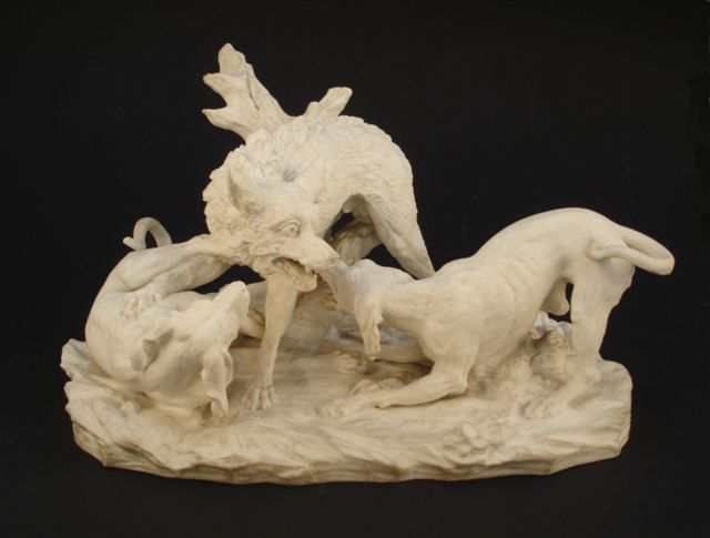 Il semble que ce Surtout des Chasses soit dû au sculpteur Pierre Blondeau d'après les créations du peintre animalier Jean-Baptiste Oudry.