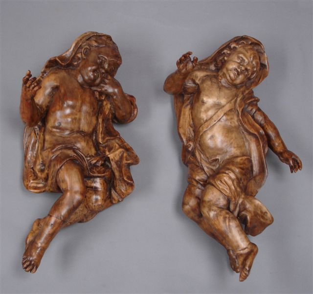 PAIRE D'ANGELOTS en noyer sculpté. Ils sont représentés en haut-relief. Leurs corps mouvementés et l'agitation de leurs drapés suggèrent le vol des deux angelots. (restaurations)