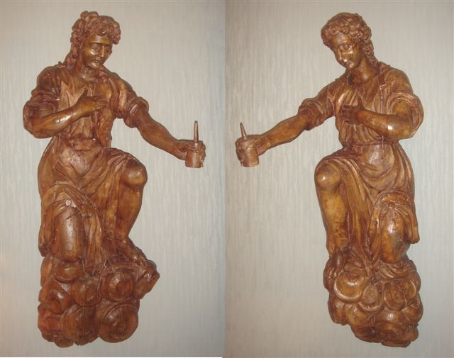 DEUX GRANDES STATUES d'ANGES CÉROFÉRAIRES, en bois naturel sculpté, agenouillés sur des nuages. (accidents. manques).