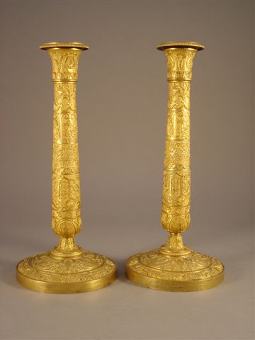 PAIRE de FLAMBEAUX en bronze doré et ciselé. Binets ornés d'une frise de feuilles d'eau, et de bobèches agrémentées de quatre lyres sur une frise de feuilles d'acanthe. Fûts cylindriques ornés en bas relief sur un fond amati et sur quatre registres de cornes d'abondance entrecroisées, de feuilles d'acanthe et de chutes de fleurs, de corbeilles fleuries et de pampres. À la base, une frise de fleurettes.