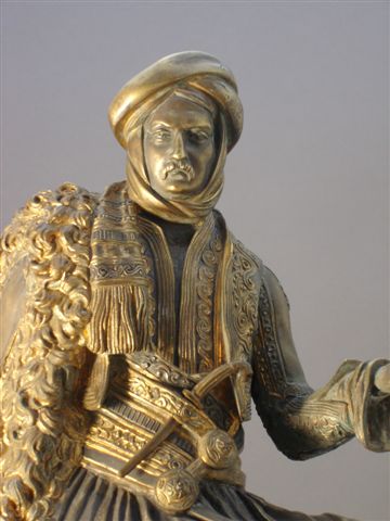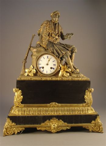 PENDULE en bronze doré au thème de l'Indépendance de la Grèce. Le cadran, de forme ronde, émaillé blanc et à chiffres romains est contenu dans un tertre rocheux. Un soldat grec y est assis, son fusil à ses côtés. La scène repose sur un socle de marbre noir orné à la base de larges feuilles d'acanthe de bronze doré. L'ensemble est soutenu par une plinthe en doucine de bronze doré s'appuyant sur un socle de marbre noir dont le piètement de bronze doré est constitué de têtes de lion d'où s'échappent des enroulements. (manques).