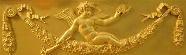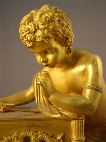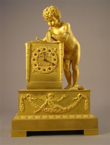 PENDULE en bronze doré. Cadran constitué d'une couronne de douze marguerites enrubannées, au centre d'une borne flanquée de deux carquois. Un enfant drapé, des coquillages à ses pieds, y est accoudé. L'ensemble repose sur un socle rectangulaire orné d'une guirlande de fleurs enrubannées sur laquelle se balance l'Amour. Piètement en plinthe. (manques).